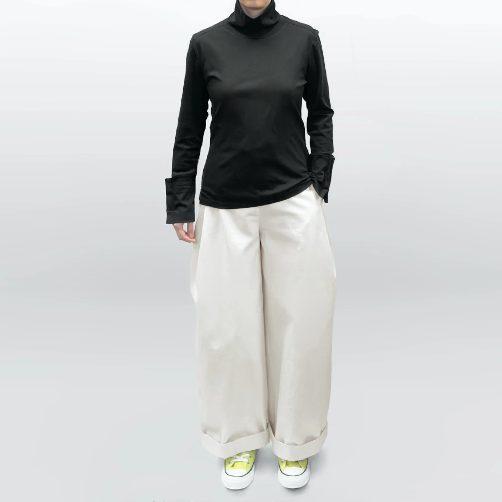 ・大きなタックが特徴の超ワイドパンツ。ネオンイエローのステッチがワンポイント。